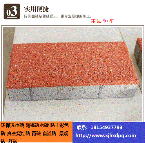 彩色透水磚:透水磚與傳統(tǒng)的彩色路面磚不同,它呈多孔、蜂窩狀結構,本身有自然積存、自然滲透、自然凈化功能。它能有效的解決城市熱島效應、除塵降噪,是海綿城市建設不可缺少的路面材料。聯(lián)系熱線18154927793李經(jīng)理或者0991-6867420.
