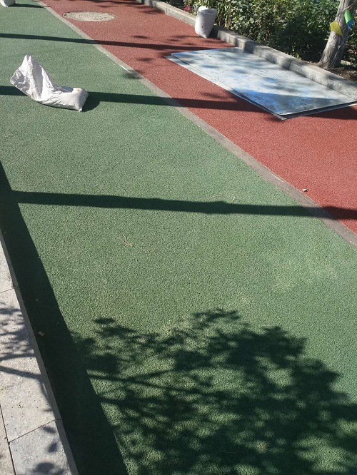 用粉筆圈出填補(bǔ)范圍,用路面涂料填補(bǔ)后刮平(用小刮刀)。(六)自行車(chē)道防滑紋施工1、使用耙子進(jìn)行施工。2、調(diào)整杷子四面高度,與地面保持平行;如果地面凹凸不平,可在杷子上蹲人,增加重量。3、在涂料里面加入細(xì)骨料(骨料加入量為20%,骨料直徑為0.8-1.5mm)進(jìn)行攪拌,攪拌均勻后加入1%-2%的固化劑進(jìn)行攪拌,攪拌均勻后直接涂敷在地面上用耙子進(jìn)行刮耙。