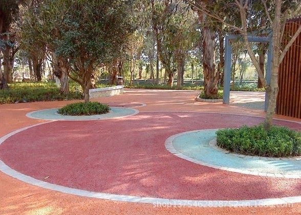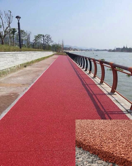 在傳統(tǒng)的熱碾式路面工藝中,鋪筑好瀝青砂膠層之后,以彩色石料按照每平方米 5kg 以上的用量代替部分普通石料,在瀝青砂膠層仍保持足夠溫度時散布碾壓,使石料部分嵌入瀝青砂膠層內(nèi),即可形成彩色路面。彩色石料的用量決定了這種路面的彩度。